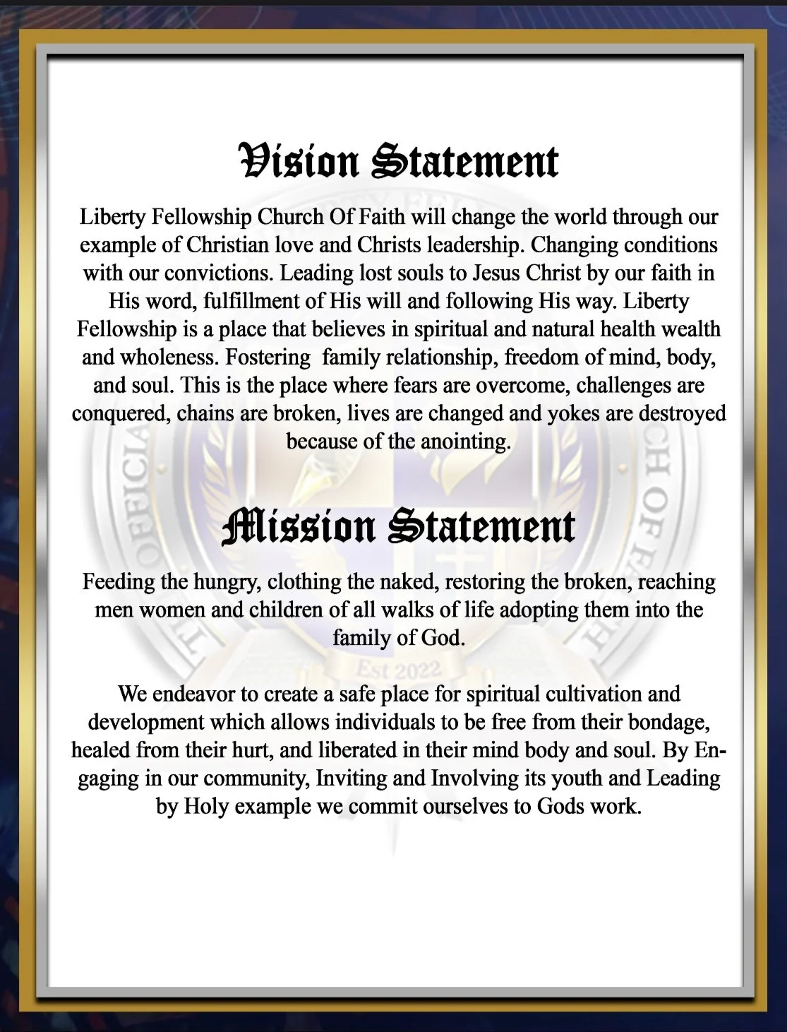 Founded in faith during a tragic transition from a former ministry that left us without a house of worship, to establishing a forward focused church family with a pure heart for God and sincerity for service. Liberty Fellowship Church is a multidimensional ministry with an intimate culture curated for persons sincerely seeking to deepen their relationship with God and understanding of His word.